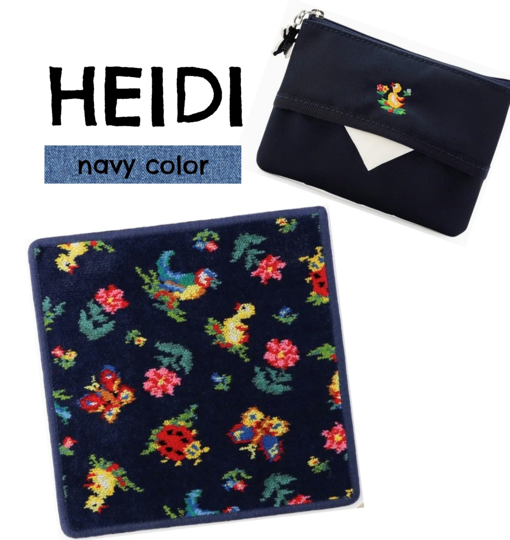 学校フェイラーシリーズのティッシュポーチとハイジ柄ネイビーのハンカチをご紹介致します。